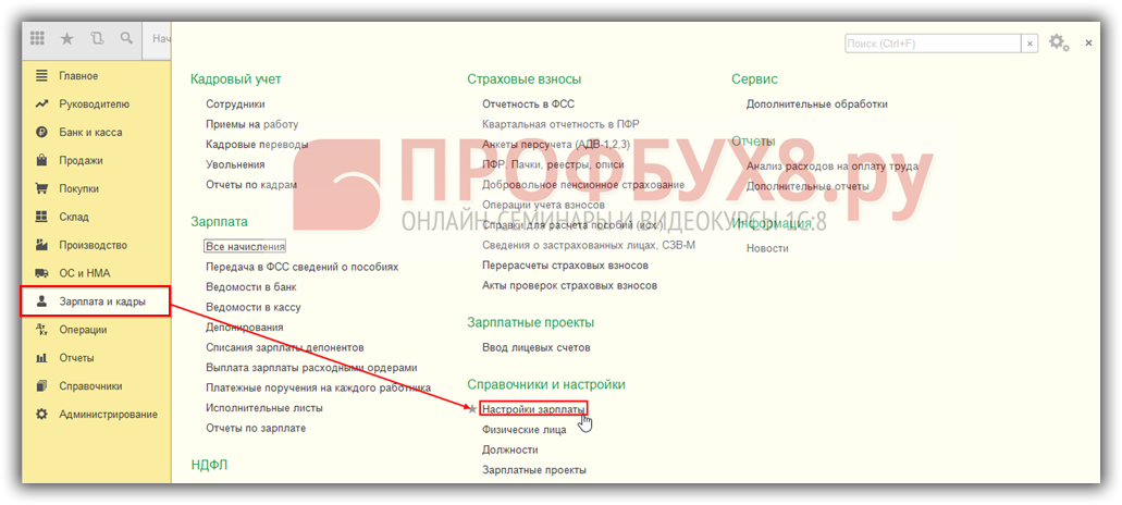 Необходимо создать новое удержание в плане видов расчета Удержания. Переходим Зарплата и кадры – Справочники и настройки – Настройки зарплаты: