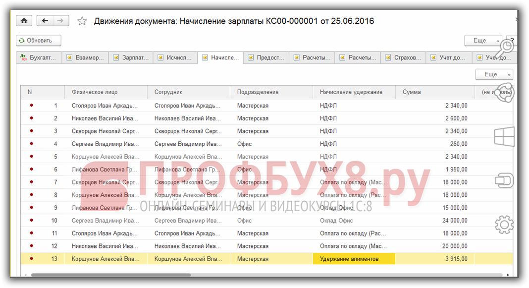 Далее таблица документа заполнится и на вкладке Удержания можно увидеть, что удержание алиментов заполнилось корректно: