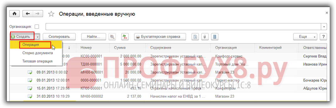 Проводка по регистрации удержания фиксируется документом Операция, введенные вручную. Для этого переходим Операции – Бухгалтерский учет – Операции, введенные вручную: