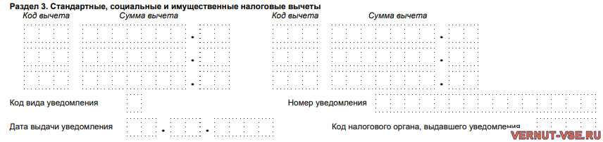 Раздел 3 касается исключительно сведений о вычетах различного характера. Требуется указать коды вычетов и их размер в рублях. Вычеты могут быть: