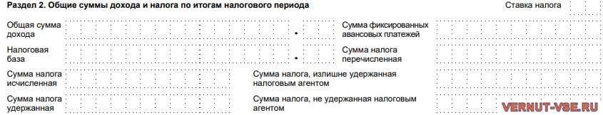 Раздел 2 содержит информацию об общем размере дохода и сумме налога за отчетный период (год). Заполнению подлежат следующие строки: