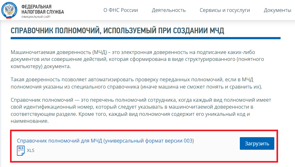 У ФНС есть свой специальный справочник полномочий (СППР). Он размещен на официальном сайте в разделе «Представление налоговой и бухгалтерской отчетности».
