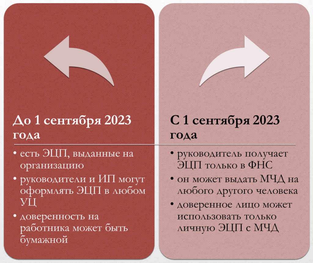 Раньше работники получали электронную подпись сотрудника с данными компании и подписывали документы ей. Теперь принцип изменился — работники оформляют электронные подписи как физлица и дополнительно получают машиночитаемую доверенность. С 1 сентября 2023 года этот порядок стал обязательным — таково требование федерального закона №536 ФЗ от 19 декабря 2022 года.