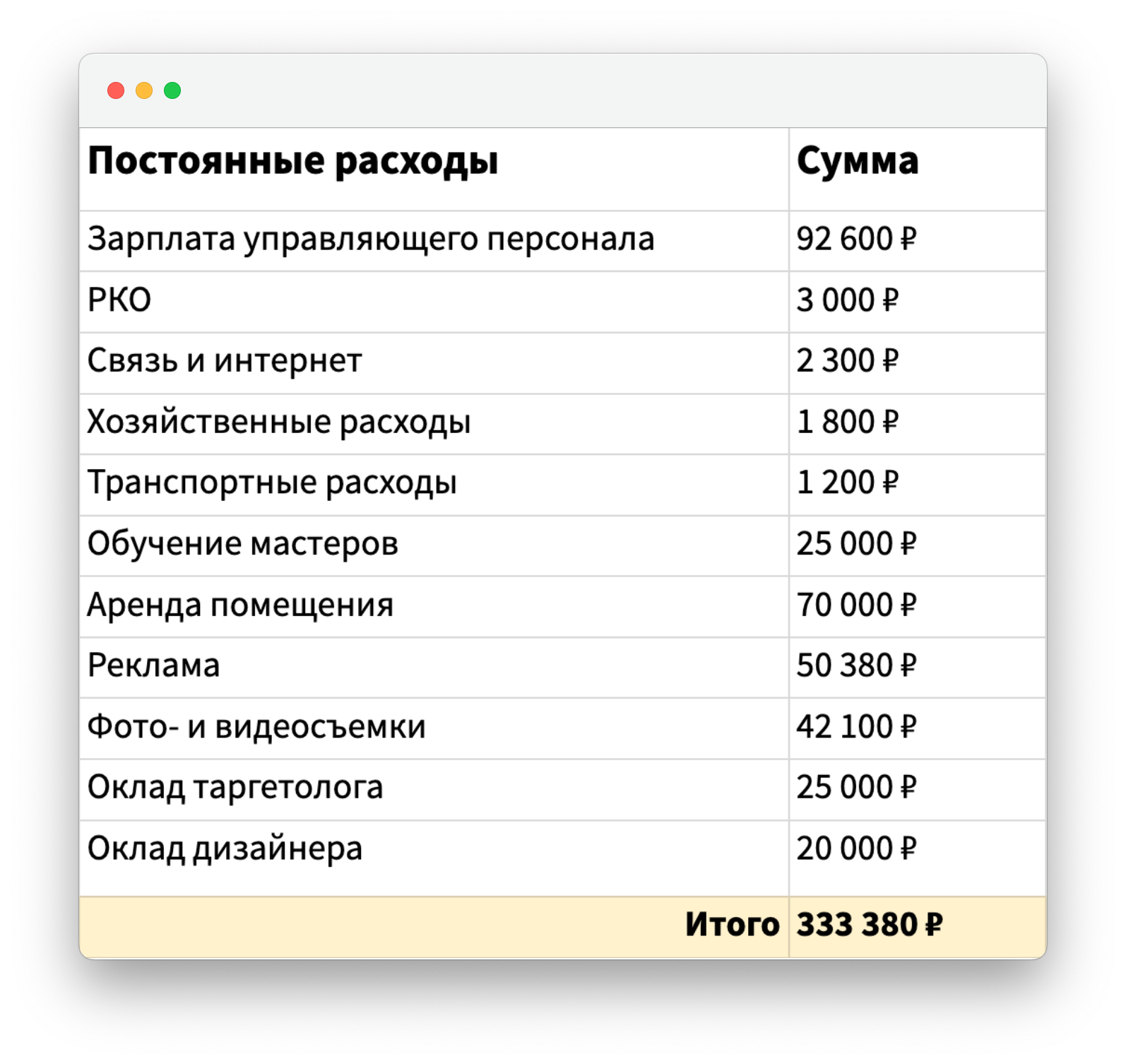 Пример расчёта себестоимости продукции. Допустим, у компании такие показатели расходов за месяц.