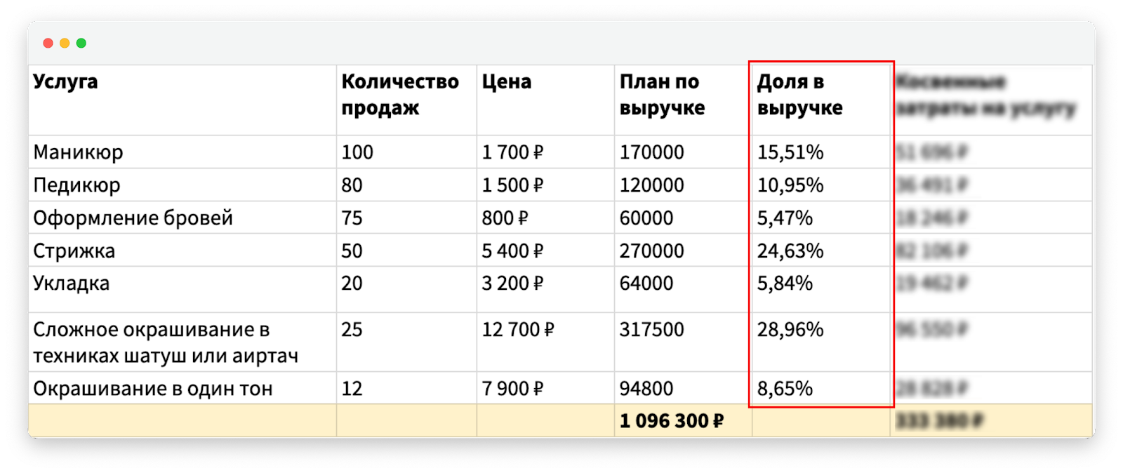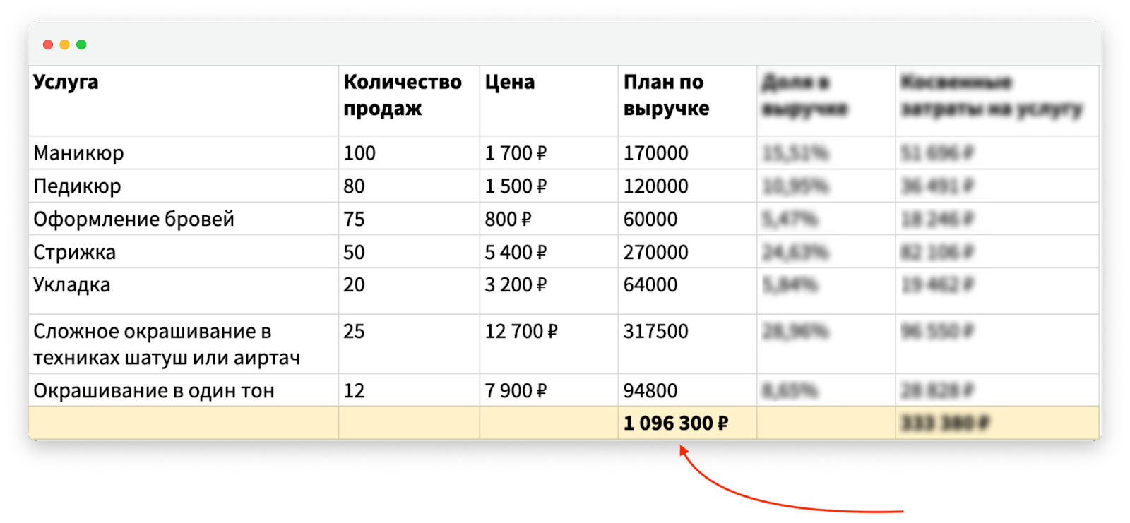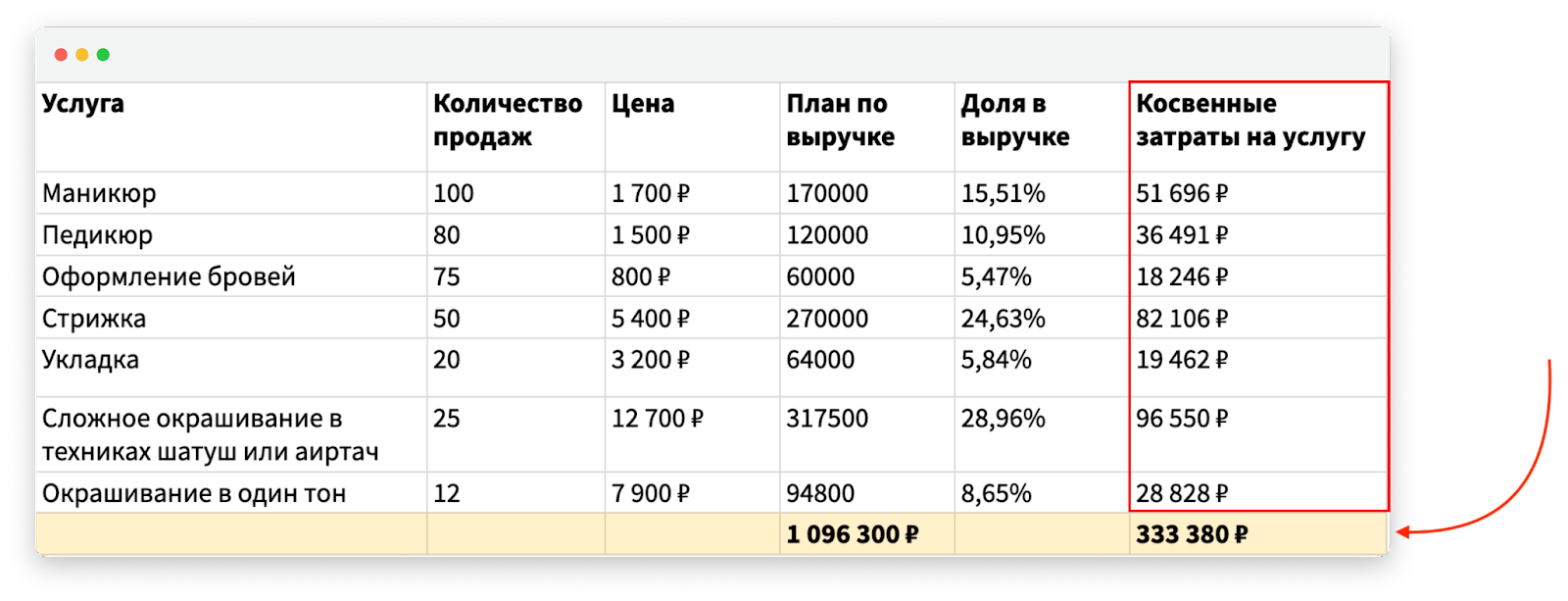 Поставить план по выручке для каждой услуги. Сейчас мы знаем, что косвенных расходов у салона — почти на 334 000 рублей. Распределить их по услугам нужно пропорционально: большие затраты лягут на те услуги, которые приносят больше выручки.