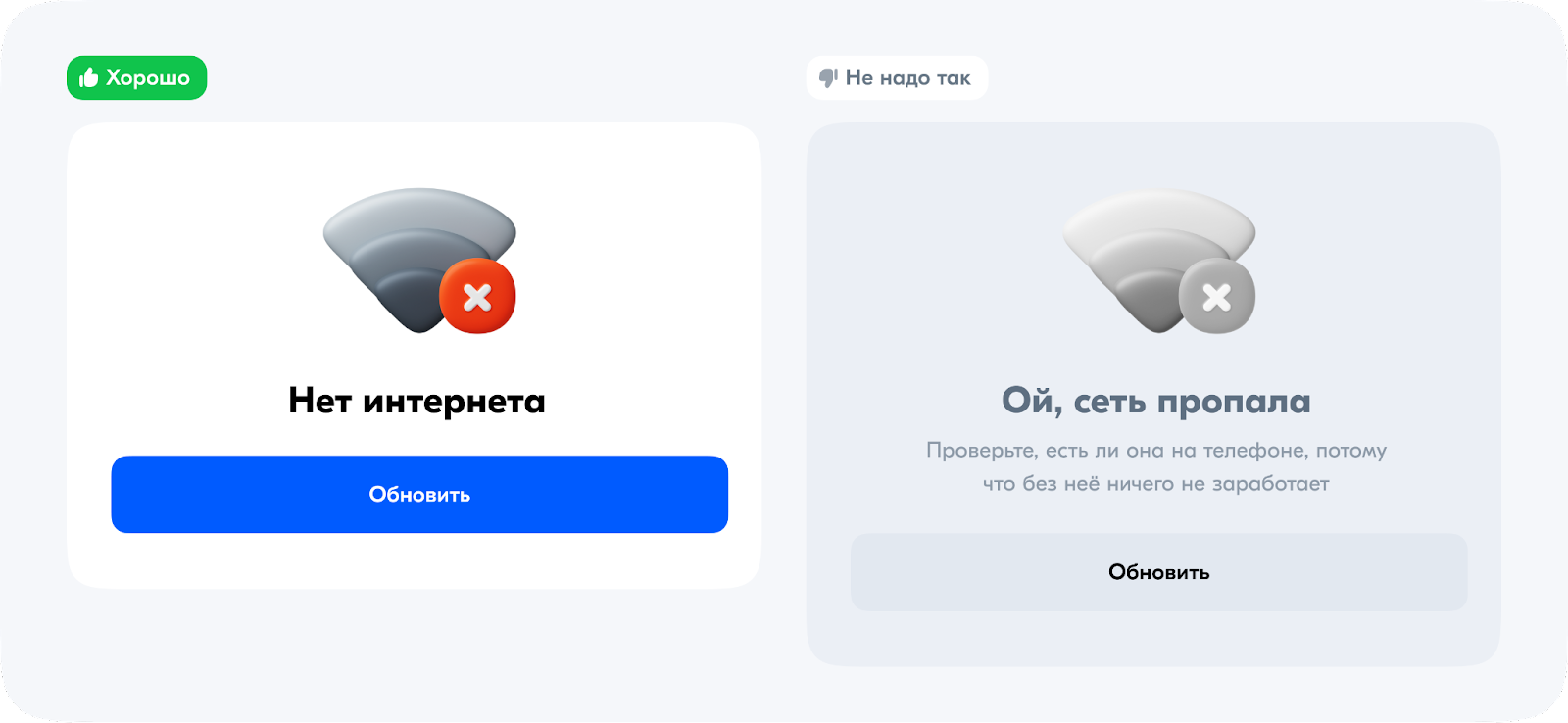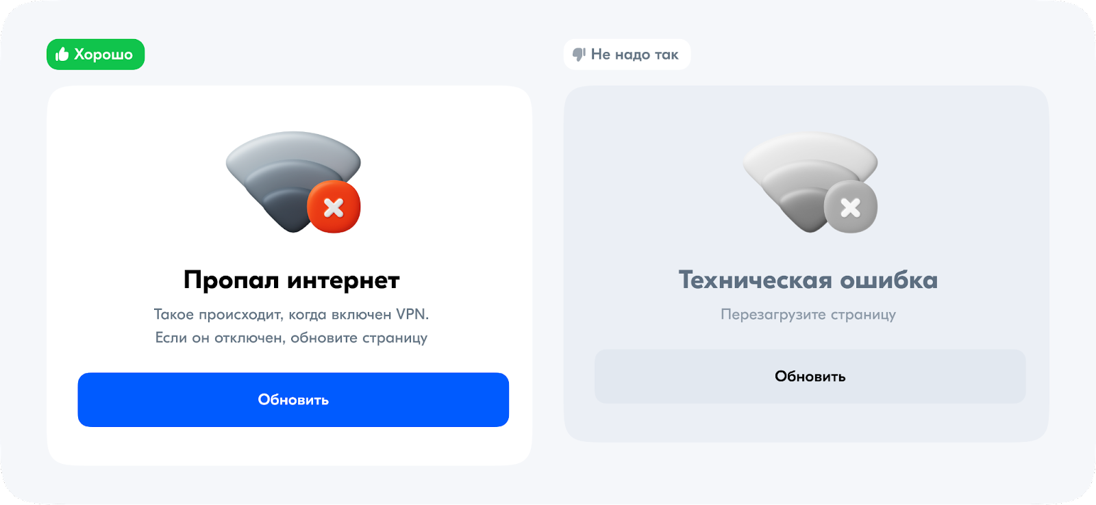 Если нет интернета, нет смысла просить пользователя проверить соединение. Большинство людей не понимают, как это сделать, — и в итоге всё равно жмут на «Обновить».