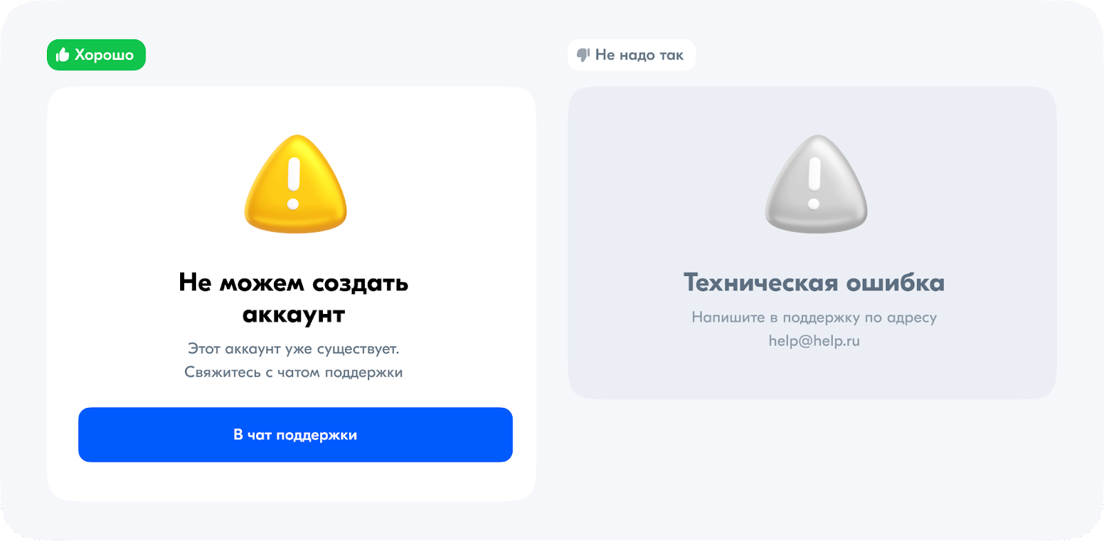 Недостаточно сказать, что произошла какая-то ошибка. Нужно объяснить пользователю, что делать в этой ситуации. Кстати, не стоит писать в тексте ошибки слово «ошибка». Лучше объясните, в чём проблема (конечно, мы живём не в идеальном мире, но всё же иногда это возможно!).