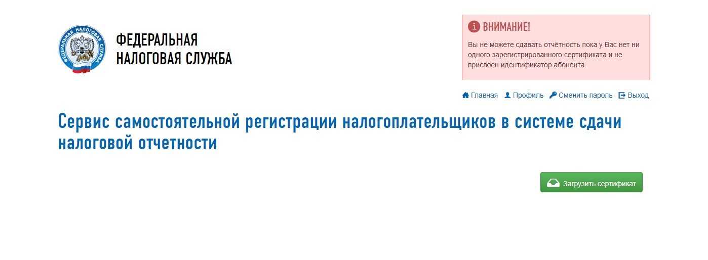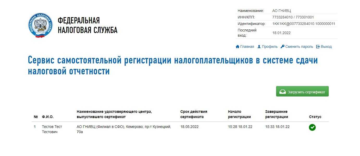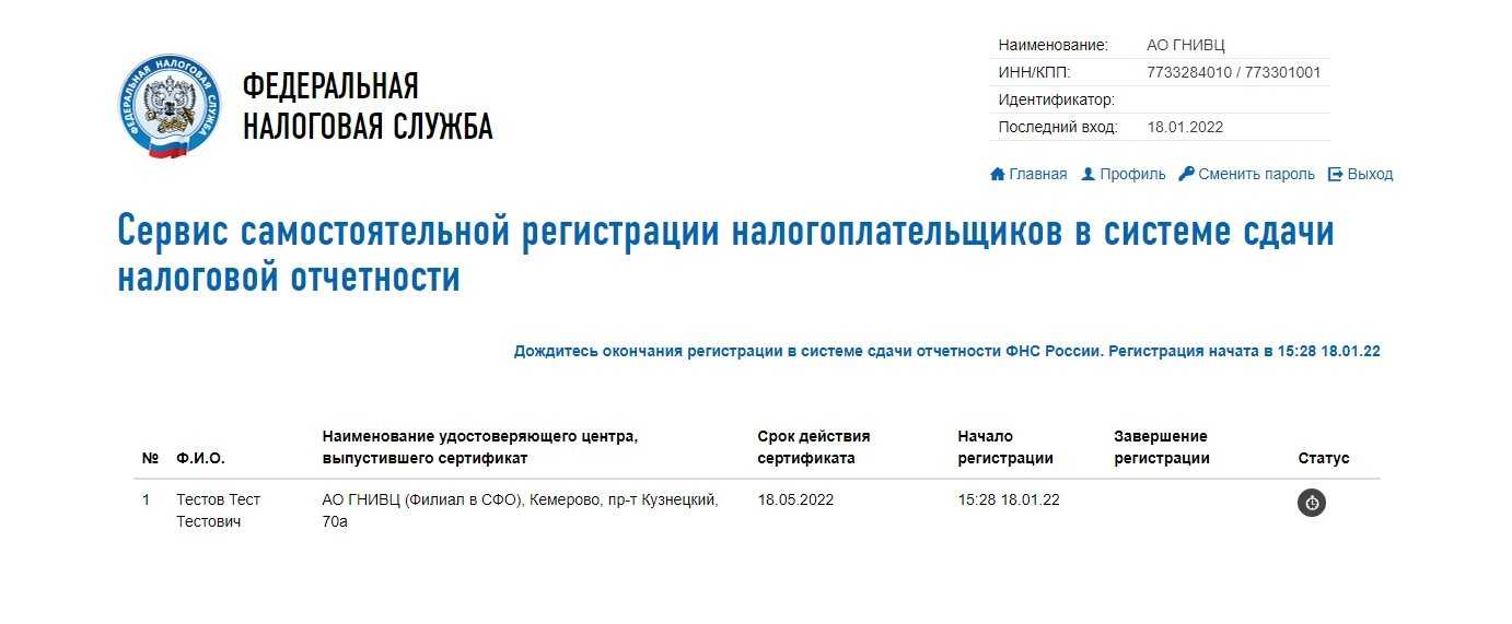 После нажатия кнопки «Загрузить» файл сертификата открытого ключа будет передан на регистрацию, откроется главная страница сервиса с информацией о процессе регистрации.