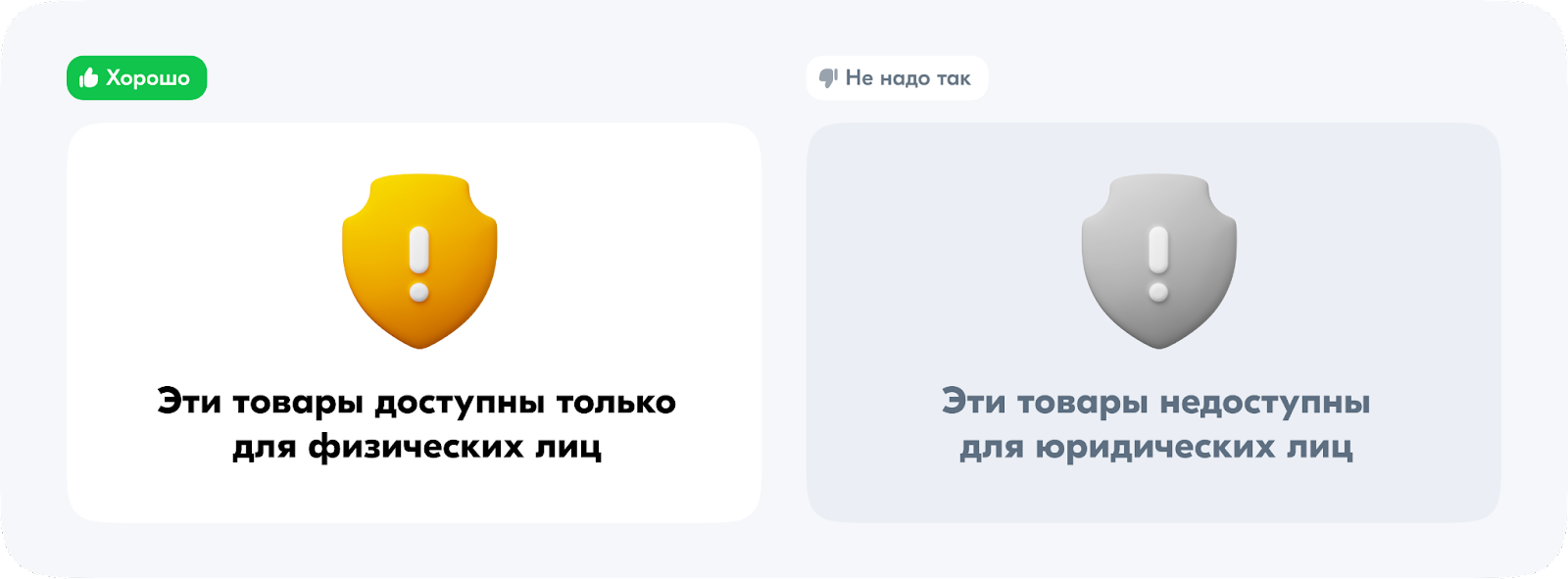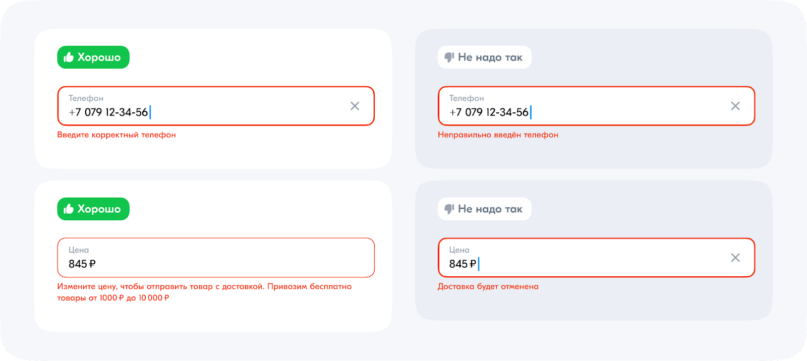 Следите за консистентностью похожих сообщений. Если мы везде пишем: «Не можем привезти сюда эти товары», не стоит писать в похожем кейсе «Данные товары невозможно доставить в этот пункт выдачи». Если писать об одном и том же обстоятельстве по-разному, пользователю будет сложно — ему каждый раз придётся вникать в текст ошибки. Поэтому лучше всего сделать библиотеку ошибок, чтобы использовать везде одни и те же формулировки, — это позволит уменьшить когнитивную нагрузку на пользователей.