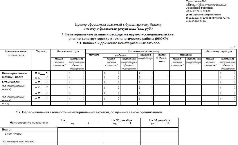 «Нематериальные активы» расшифровывает статью 110 бухгалтерского баланса. В таблицах 1 и 2 приложения к бухгалтерскому балансу указывают первоначальную стоимость активов и их суммарная амортизация соответственно. В таблице 1 также указываются списанные и приобретенные активы в течении года.
