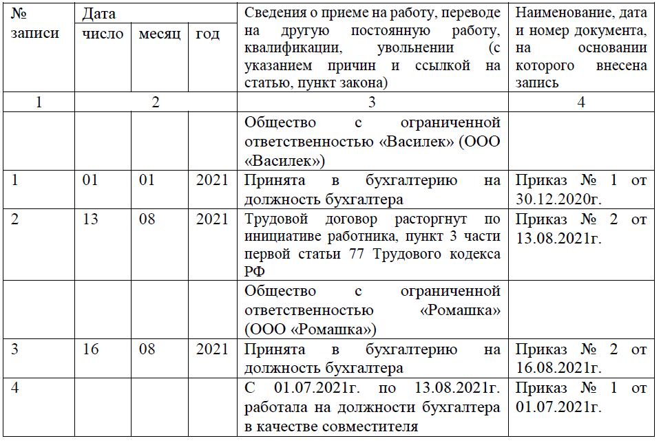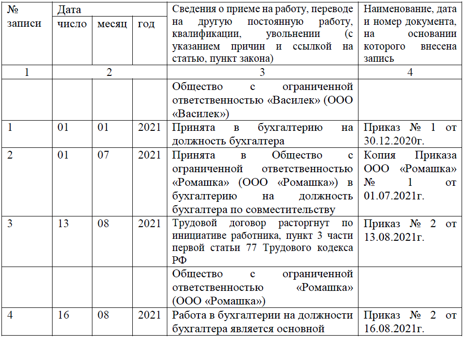 а) если запись о приеме на работу по совместительству была, то после соответствующей записи об увольнении делается запись о том, что работа становится основной.