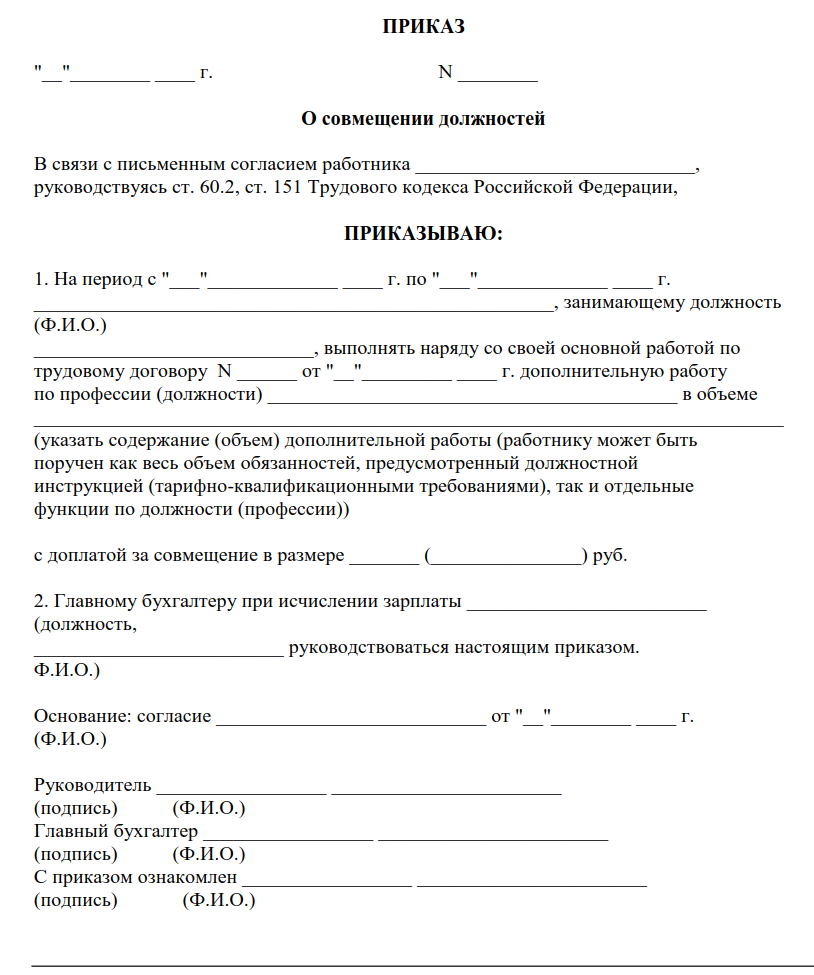 | Оформление на работу | Работник оформляется строго по форме N Т-1. | Достаточно одного приказа по основной деятельности о назначении на совмещение. |
