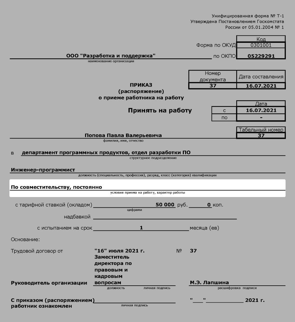 Сделать приказ о приеме на работу. Приказ оформляют по форме № Т-1. Заполнить приказ нужно так же, как при приеме сотрудника на полный день, но прописать, что работа будет по совместительству.