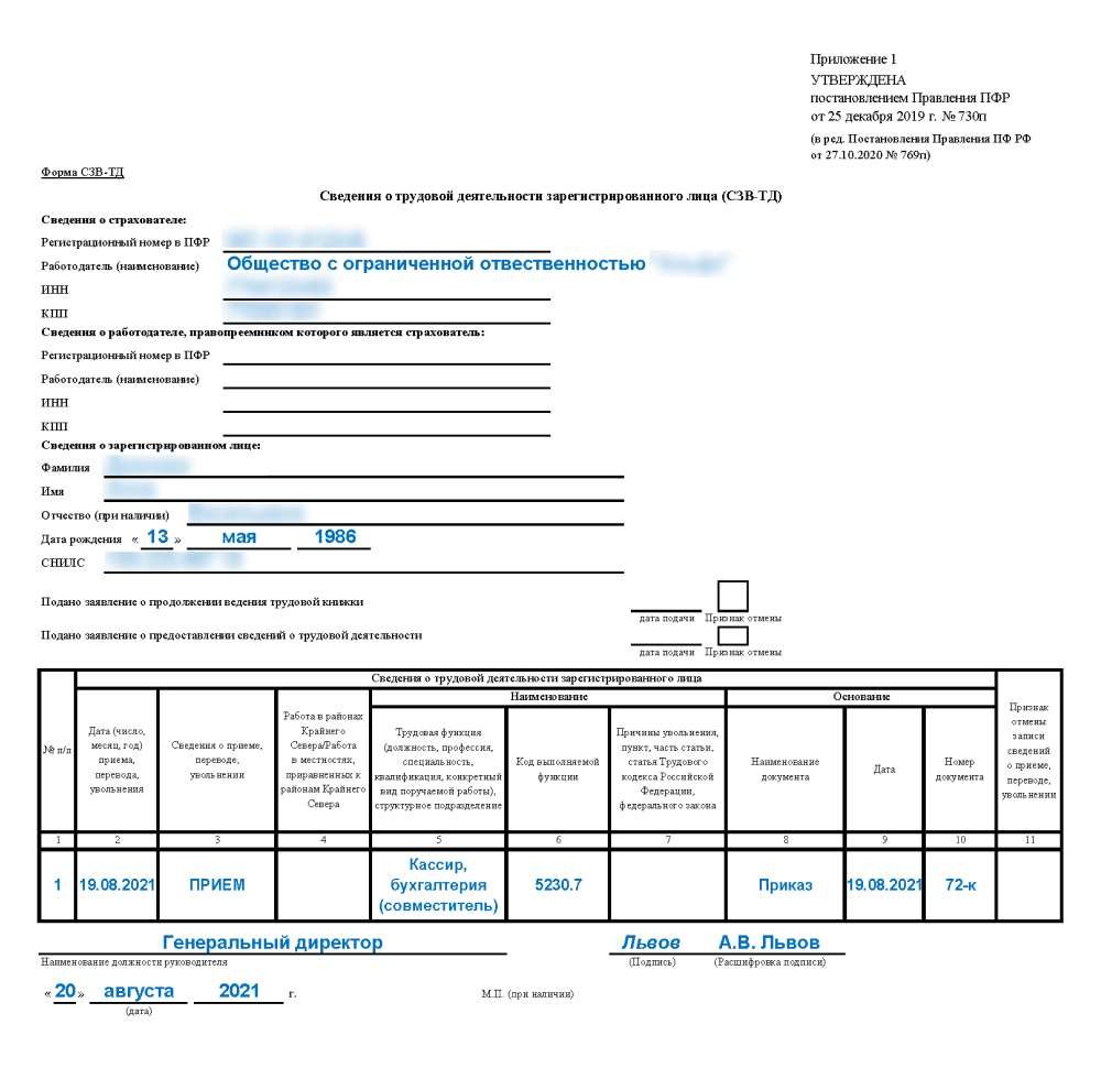 Заполнить эту форму нужно в течение рабочего дня после издания приказа при приеме на работу и увольнении и до 15-го числа следующего месяца во всех остальных случаях, например при постоянном переводе на другую должность.