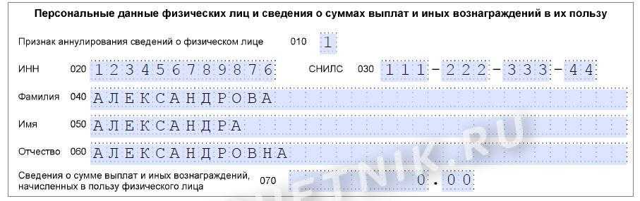 При ошибке в данных физического лица (Ф.И.О., ИНН, СНИЛС) в аннулирующем ПС заполняют строку 010, повторяют неверные сведения из первичного отчета, а в строке 070 проставляют прочерки. Одновременно формируются персонифицированные сведения с корректными данными, строка 010 этого листа остается незаполненной.