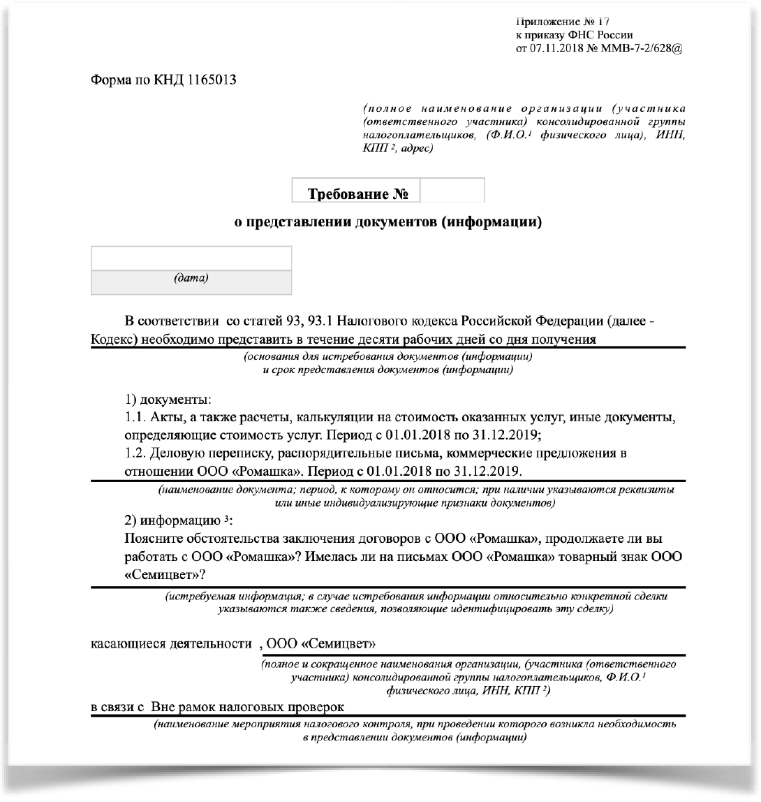 Приведем пример реального требования, полученного контрагентом одной группы компаний, подозреваемой налоговыми органами в искусственном дроблении бизнеса: