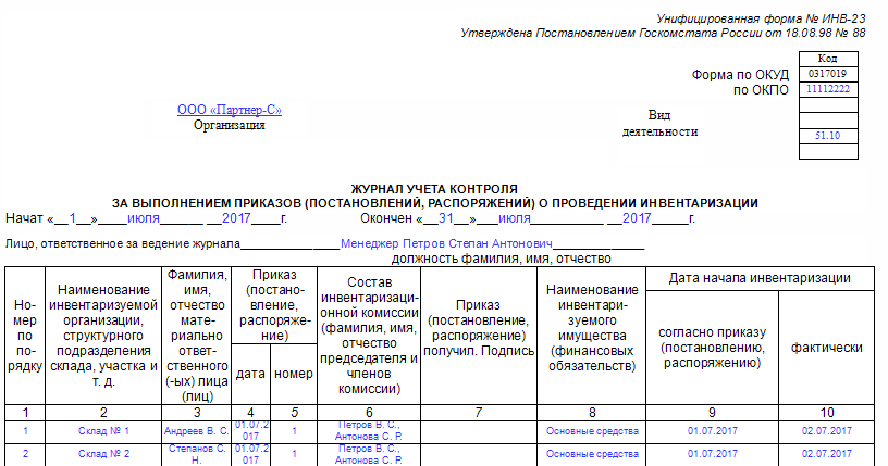 - зарегистрировать (сделать это можно, например, в журнале учета контроля за выполнением приказов о проведении инвентаризации). Точно также, как и форму ИНВ-22, форму журнала учета можно разработать самостоятельно или использовать для заполнения в качестве образца утвержденную Госкомстатом унифицированную форму № ИНВ-23;