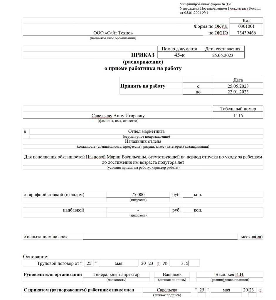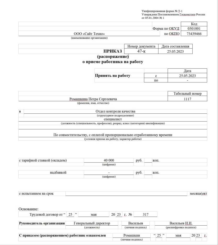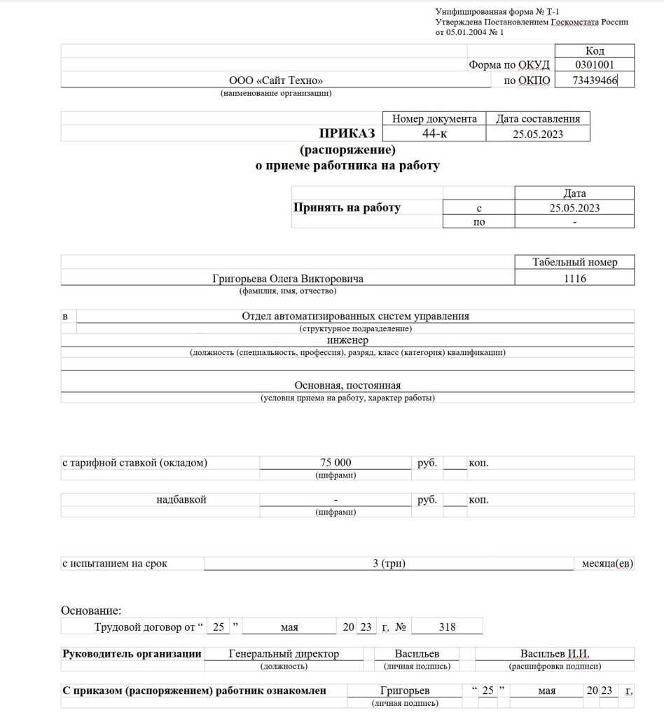 Приказ о приеме на работу (Форма Т-1). Образец заполнения
