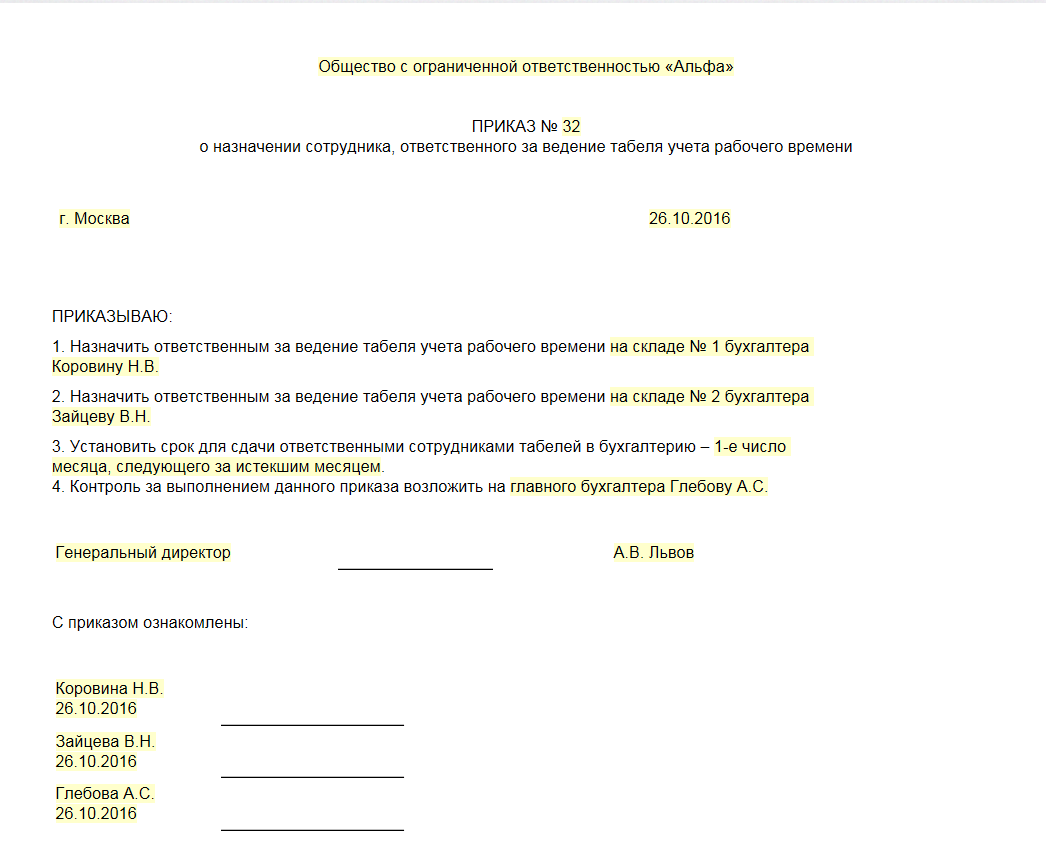 Ведут документ специально назначенные сотрудники: они фиксируют рабочее время по каждому дню. Как правило, ответственный за корректное оформление – это директор структурного подразделения (например, отдела продаж). Ответственность может разделить и его заместитель. Если компания достаточно большая, вводят специальную должность табельщика, который и фиксирует все сведения.