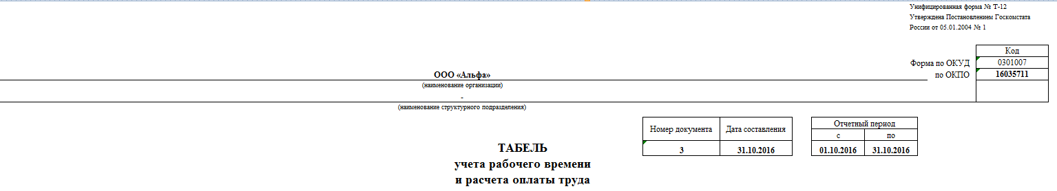 - Так, в верхней части табеля записывается полное название компании, а в скобках — ее краткое название.