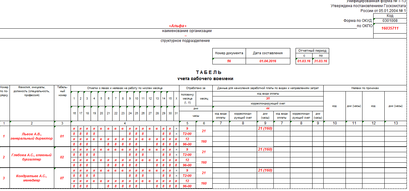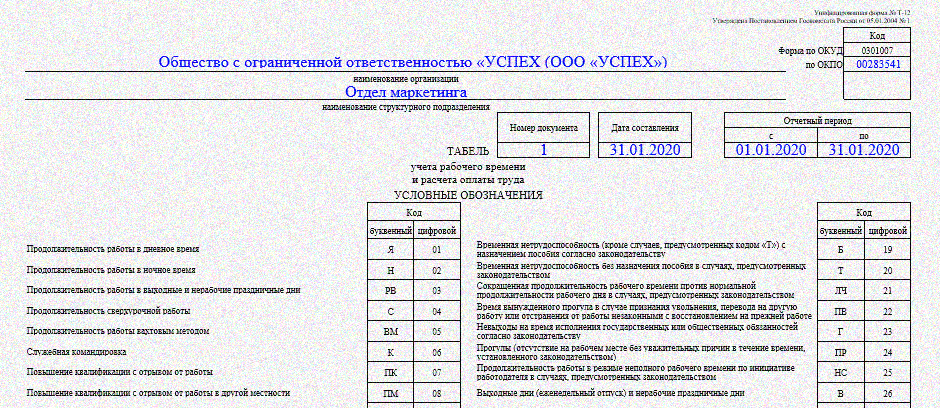 Способы заполнения формы Т-13, основные коды для заполнения табеля