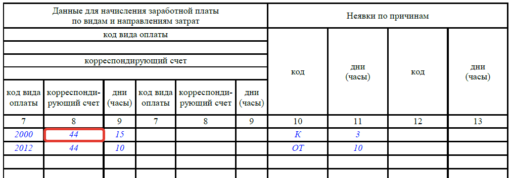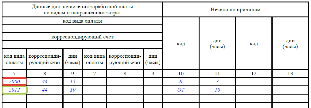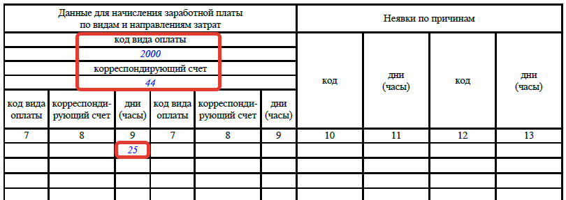 Если видов оплаты труда несколько, например, работникам выплачивается заработная плата, кому-то отпускные, компенсация по больничному листу и т.д., то заполняются графы 7-9. Для каждого вида оплаты нужно указать его цифровое обозначение, счет отнесения затрат и количество дней (часов), которые должны быть оплачены по данному виду оплаты труда.