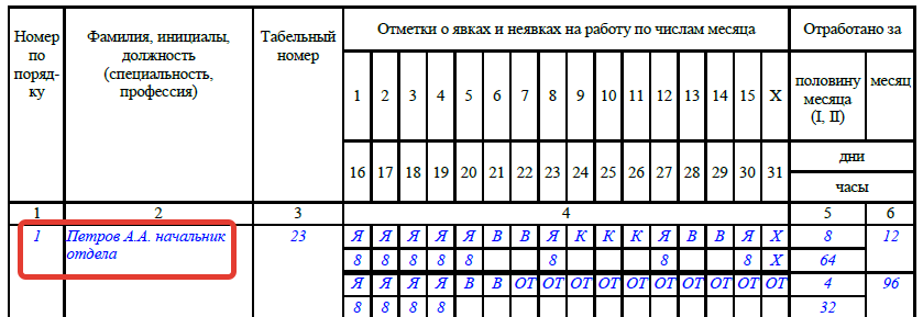 При заполнении применяется единая система обозначений. В табеле осуществляется учет отработанного времени в соответствии с правилом «для одной должности предназначается одна позиция»