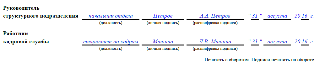 Заполнив бланк, уполномоченные лица обязаны подписать его, записать дату оформления.
