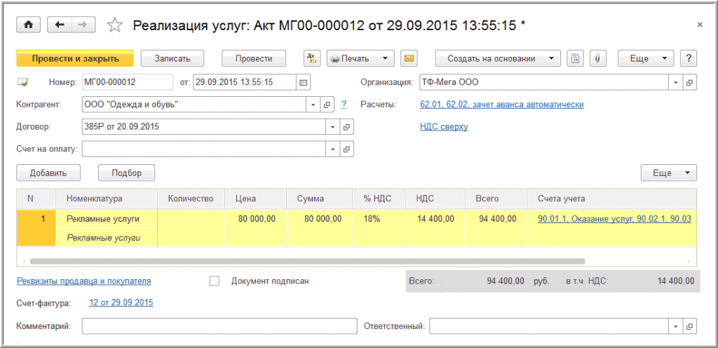 Оказание рекламной услуги покупателю ООО «Одежда и обувь» в программе «1С:Бухгалтерия 8» (ред. 3.0) регистрируется с помощью документа Реализация (акт, накладная) с видом операции Услуги (акт) (раздел Продажи, подраздел –> Продажи, гиперссылка Реализация (акты, накладные).