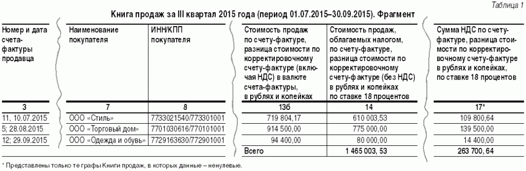 Выставленный при оказании рекламных услуг счет-фактура регистрируется в книге продаж за III квартал 2015 года — см. табл. 1.
