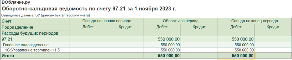 Сформируйте оборотно-сальдовую ведомость по счету 97.21, чтобы удостовериться, что все сделано правильно и сумма введенного РБП появилось в бухгалтерском учете.