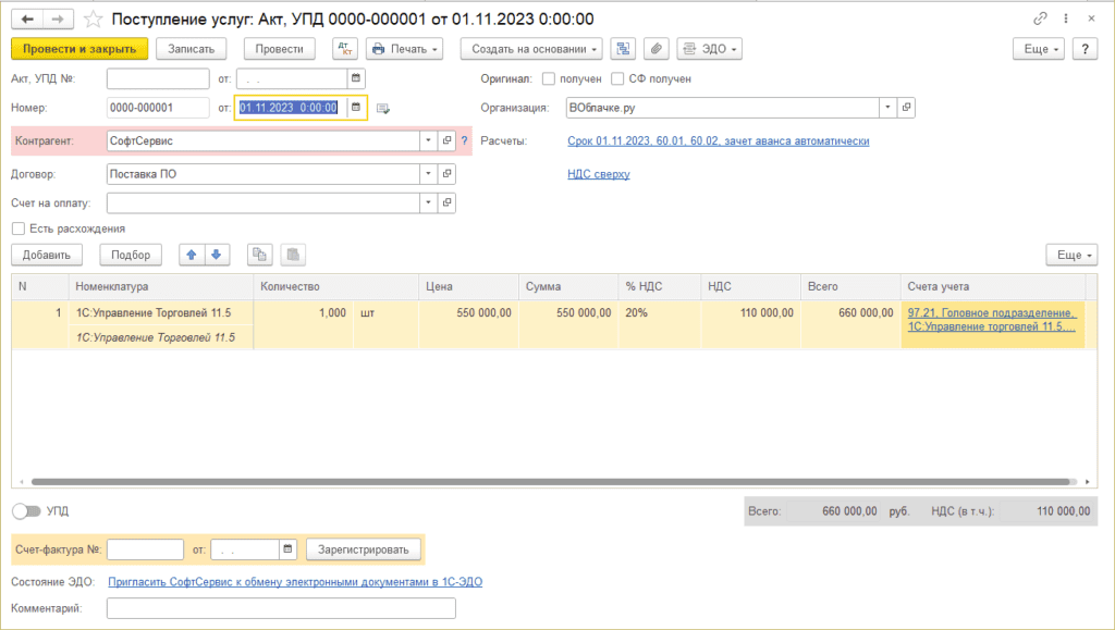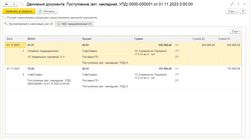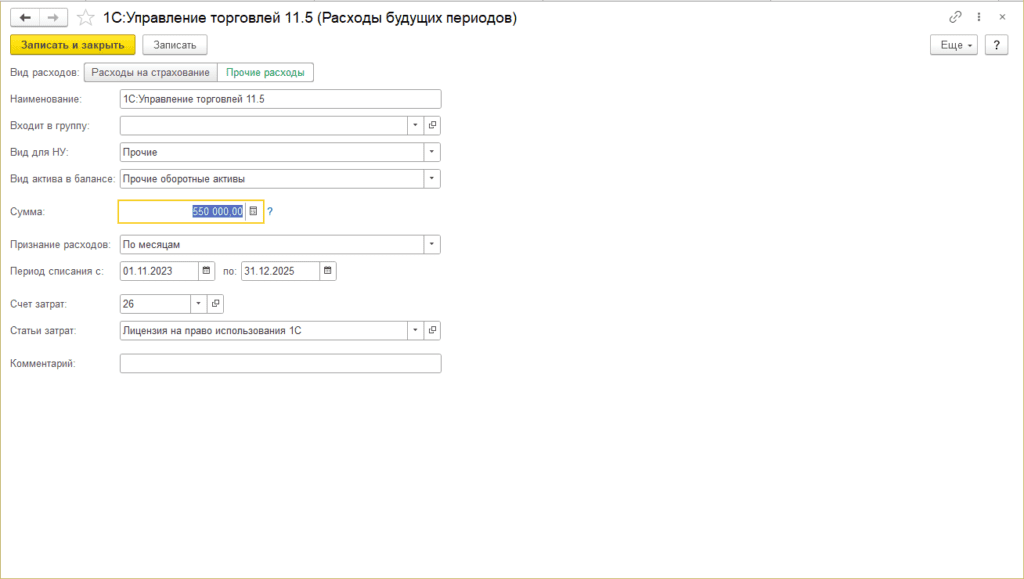 Для полноты примера отразим поступление расходов будущих периодов 01 ноября 2023 года, оформим приобретение исключительных лицензионных прав на программный продукт 1С:Управление торговлей 11.5, стоимость 550 000 рублей.