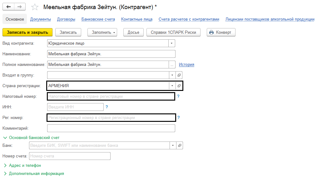 При выборе страны-поставщика, в карточке контрагента импортёра появляются дополнительные поля, на которые следует обратить внимание, в частности, если страна-импортёр не Россия. В таком случае требуется заполнить такие поля, как налоговый и регистрационный номера в стране регистрации