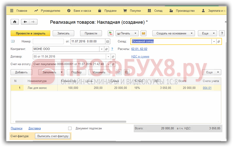 Сформированный счет-фактура не делает записи в журнале. Регистрируется в Книге продаж как выручка: