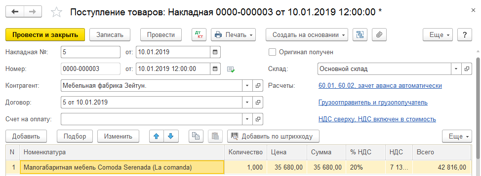 Создадим документ реализации, перейдя на основании счета покупателю. Документ в 1С 8.3 заполняется автоматически на основании счета покупателю: