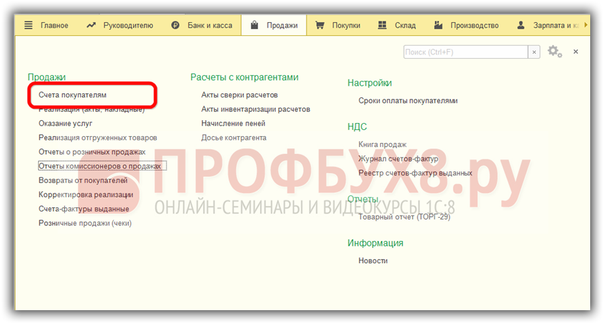 Выпишем счет покупателю для оплаты. Меню Продажи – Счет покупателям: