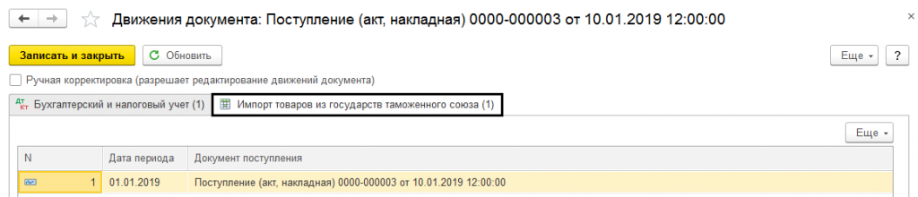 После проведения документа, помимо бухгалтерских проводок, будет сформирована запись в регистр «Импорт товаров из государств таможенного союза». Движения документа можно отслеживать с помощью кнопки Дт/Кт.