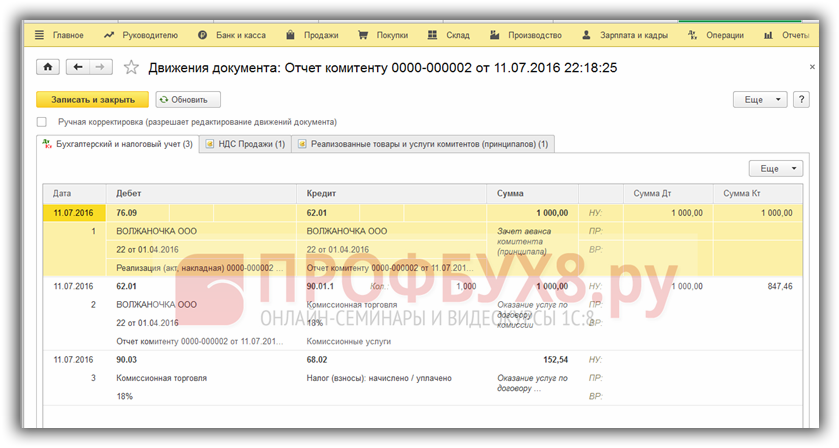 Проведенный документ Отчет комитенту дает такое движение: