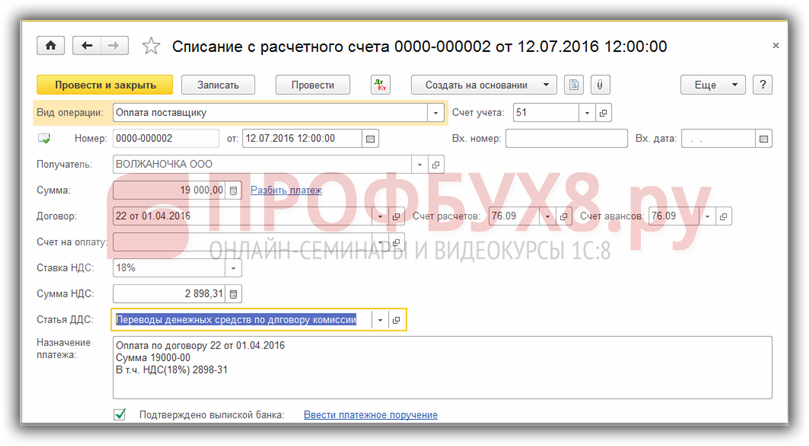 Создадим документ Банковская выписка с видом Списание с расчетного счета на основании выписки полученной из банка: