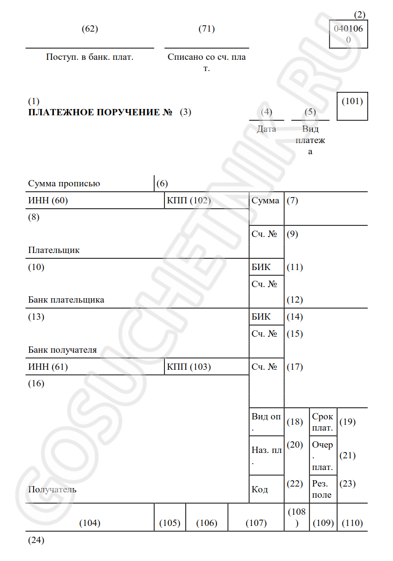 Лучше не допускать никаких ошибок при заполнении платежных поручений. Они часто обрабатываются автоматически, поэтому компьютер не сможет правильно разнести деньги из-за некорректных реквизитов. Поле 106 может принимать значение только в виде двухбуквенного кода или цифры 0.