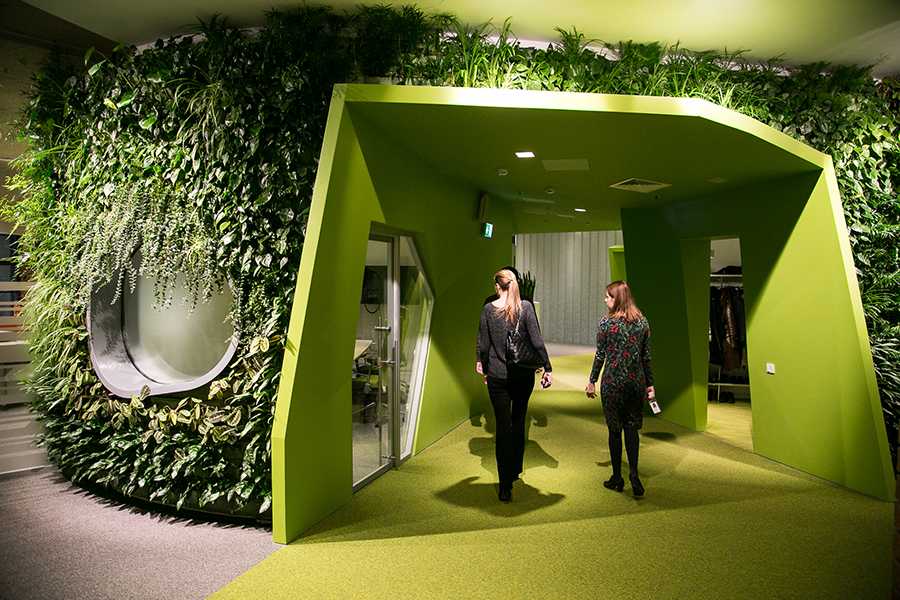 Чтобы улучшить показатели микроклимата, в офисе применяют технологии озеленения. Растения дополнительно очищают воздух, насыщают его кислородом, фитонцидами. В «зеленом» офисе меньше пыли и шума, лучше запах, а воздух ионизирован. Для озеленения используют декоративные растения (обычно фикусы, драцены, орхидеи), деревья в кадках (могут быть хвойными, цитрусовыми, экзотическими). Возможно устройство фитостен: кроме коррекции микроклимата они обеспечат зонирование и уменьшат распространение шума.