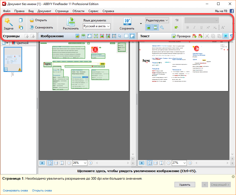 На панели окна Изображение можно выбрать и отметить области распознавания, проверить результат работы и двух сопоставляемых (слева и справа) окнах. В правом – результате распознавания – при помощи встроенного текстового редактора правки можно вносить прямо в нем.