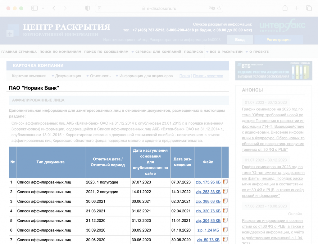 - ООО «Интерфакс — Центр раскрытия корпоративной информации»;