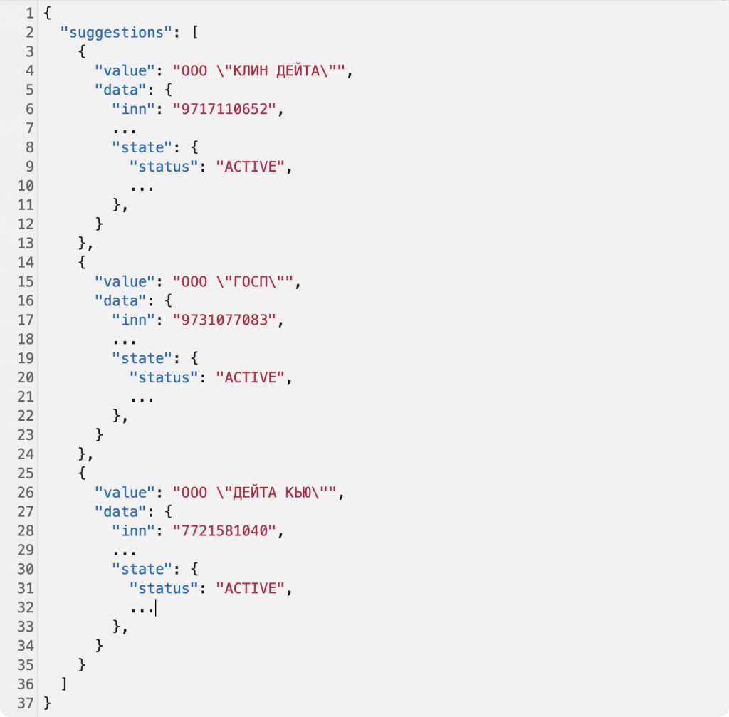 API-метод «Аффилированные компании» найдет связанные организации по ИНН учредителей и руководителей: физических и юридических лиц. Заодно покажет статус юрлица: действует, ликвидировано, банкрот, находится в процессе реорганизации или ликвидации. Это поможет заметить однодневку, не копаясь в ЕГРЮЛ.