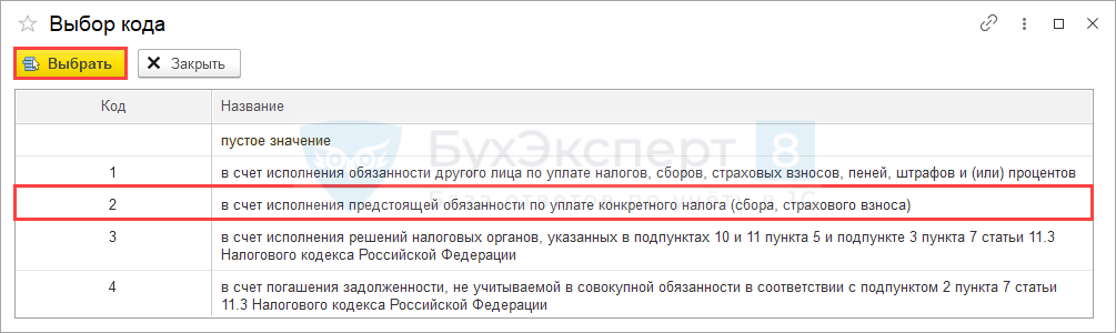 Укажите вручную цифровое значение из закрытого перечня, соответствующее способу зачета (в нашем примере — 2).