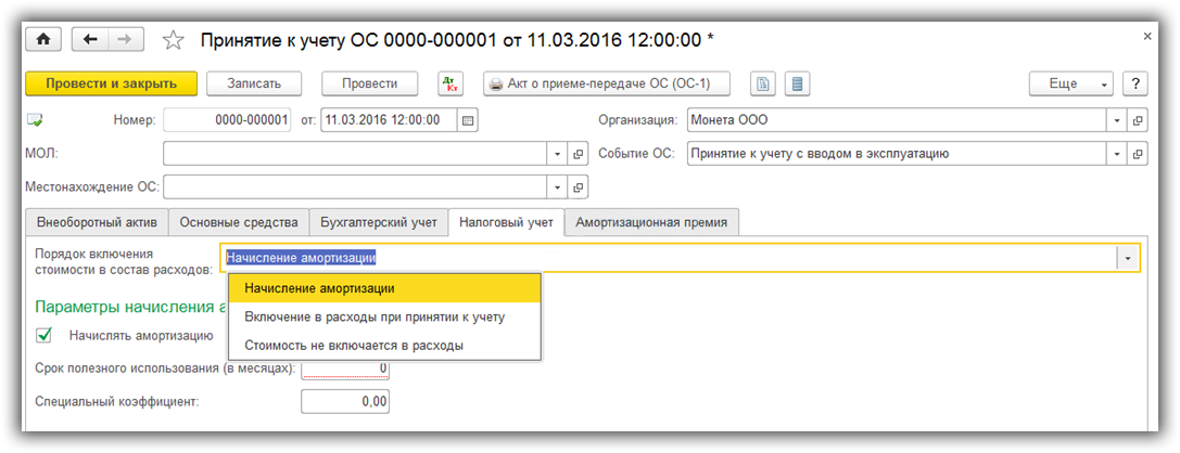Амортизация наших ОС будет рассчитываться при закрытии месяца, начиная с месяца, следующего за принятием к учету. Настройки касающиеся амортизации должны быть отражены в учетной политике организации.