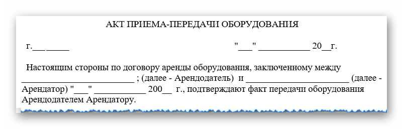 Заполнение начинается с записи вверху по середине строки названия бланка «АКТ ПРИЕМА-ПЕРЕДАЧИ ОБОРУДОВАНИЯ»