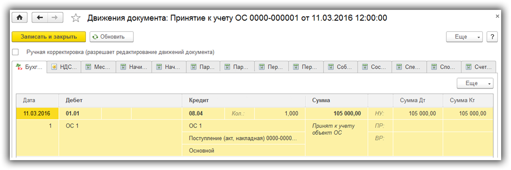 Документом Принятие к учету ОС были сформированы следующие проводки: