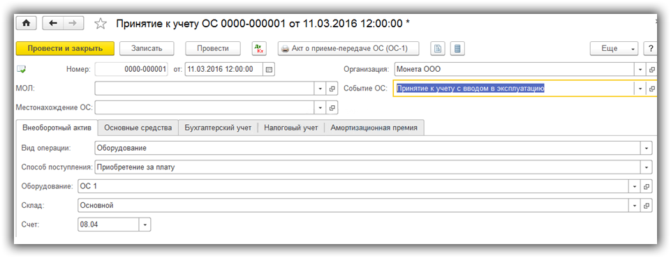 Ниже пошагово рассмотрим, как оформляются документы в программе. Первое что необходимо сделать, это оформить поступление нашего ОС и принять его к учету.
