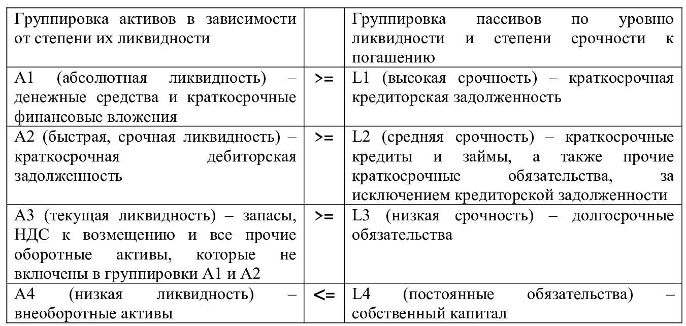 Ликвидность баланса определяет степень покрытия обязательств предприятия его активами, срок превращения которых в деньги соответствует сроку погашения обязательств (срочность возврата).